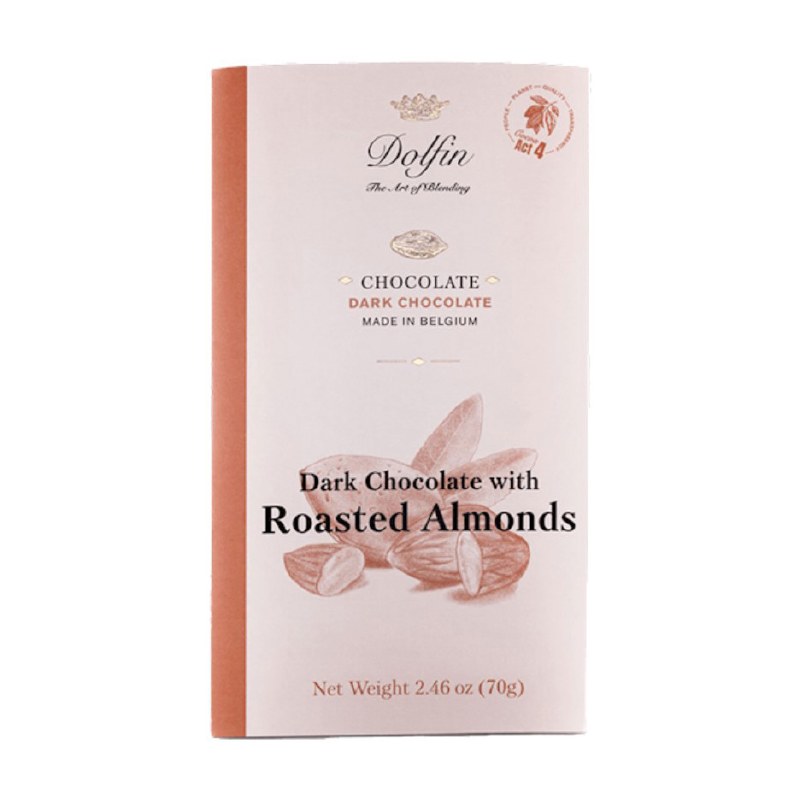 Dolfin's Dark Chocolate (60% Cocoa) with Roasted Almonds. These Dolfin Chocolate bars are Non-GMO and made by blending Belgian Chocolate with other natural ingredients to achieve unique, unusual, and delicious chocolate flavors!