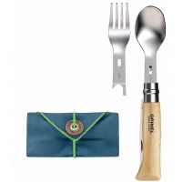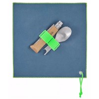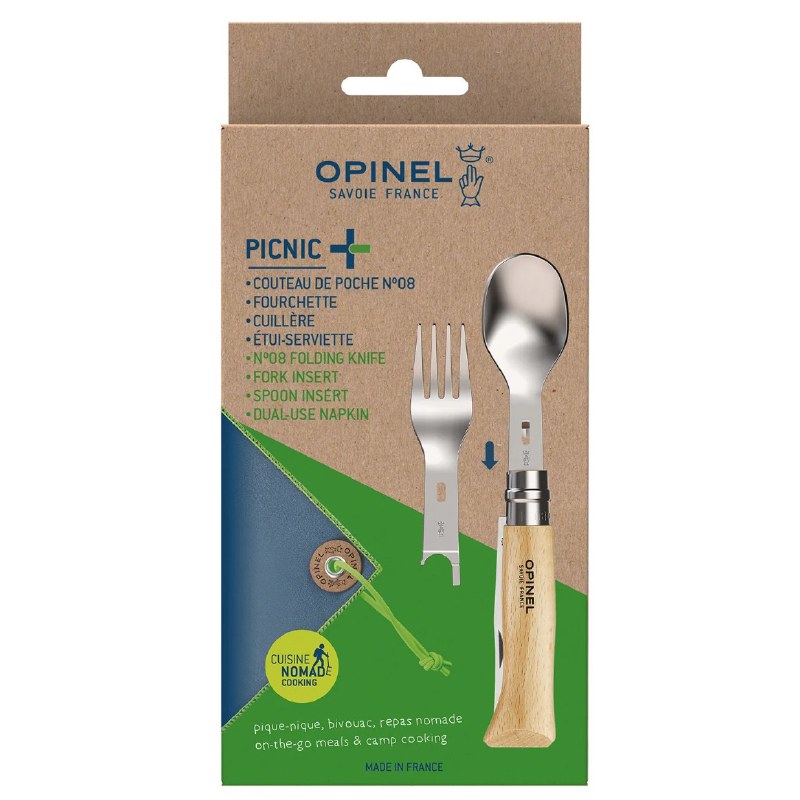 Picnic+ Complete Set with No.08 Folding Knife includes: No.08 Stainless Steel folding knife, fork insert, spoon insert, dual-use micro-fiber napkin that doubles as a carrying case.